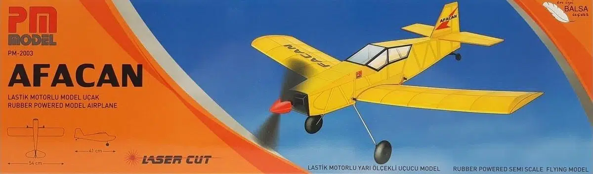 Afacan modelimiz lastik motorlu, gövdeli alttan kanatlı yapımı çok kolay modeldir. Tüm inşaat lazer kesim olup balsa ağacındandır.Afacan modelinin kutusu içinde CNC de bükülmüş iniş takım teli, plastik pervane, plastik tekerlekler, plastik başlık, plastik arka tekerlek, plastik kanat bağlama pimleri ve çıkartma seti vardır.