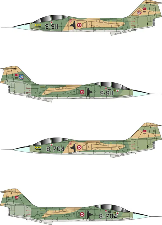 Turkish Air Forces TF-104 G (72009) Tigermeeters Turkey is one of the very first countries to receive the F-104Gs within the MAP program. As a preparation for the new aircraft the 144th Squadron was organised at the 4th AB in Mürted-Ankara. The first 15 aircraft arrived on May 10th,1963 by sea and they were deployed at the newly founded squadron in July. In July 1963 two TF-104gs arrived and they were also assigned to the same squadron. This was followed by Canadair produced 18 F-104Gs and 2 TF-104Gs. The shipment continued in 1965 with 5 more Canadair built F-104Gs. All of these planes were deployed at the 144th Squadron. In 1968 3 pcs F-104G and 1 pc TF-104G were received from USAF. The TuAF faced with the US embargo after the Cyprus peace-keeping Operation ordered a batch of 18 F-104S from Italy. 6 of the planes were delivered within the same year and the remainder in 1975 on the basis of the planes per month. In 1975 the purchase was risen to 40 planes all which were received within 1976. The CF-104s, F-104Gs, TF-104Gs and the RF-104Gs which were strated being replaced by more modern aircraft were despatched to Turkey. This operation included 17 pcs F-104Gs from Belgium, 43 pcs F-104Gs & 12 pcs TF-104Gs from Holland, 12 pcs RF-104G and one TF-104G from Norway and 165 pcs F-104Gs and 36 pcs TF-104Gs from Germany. Canada also promised to hand over the CF-104s after being replaced by the F-18A/Bs. In 1986 44 pcs CF-104G & 6 pcs CF-104D were received. These planes were allocated to the 181st and to the 182nd Squadrons.